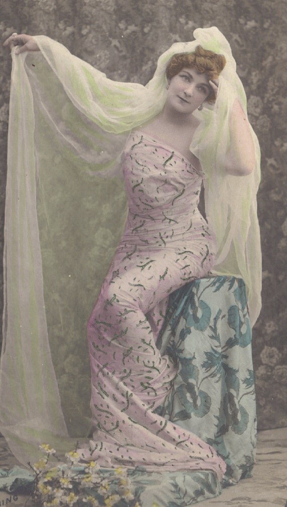 Wonderful hand-tinted image of Carmen Gilbert, by Professor Stebbing of Paris. Card was published right around the year 1900 by Monsieur G. Piprot as his star logo indicates. The veil played such an important part in these old images, and so must have been important in their routines as well. If you search online, you can often find short film clips of dancers performing during this period, but of course we are talking about some of the earliest examples of motion pictures, making a number of these Belle Epoque dancers some of the earliest movie stars!